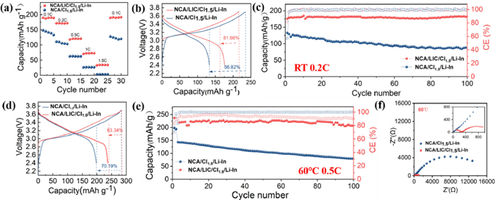 | Fig. 2. Electrochemical performances of the assembled NCA/Cl1.5/Li-In, and NCA/LIC/Cl1.5/Li-In all-solid-state batteries. (a) The rate capability test result comparison of the above solid-state batteries. (b) The initial charge/discharge curves and (c) the corresponding cycling performances of the above batteries cycled at 0.2 C at room temperature. (d) The initial charge/discharge curves and (e) the corresponding cycling performances of the above batteries cycled at 0.5 C at 60 ℃. (f) The impedance spectra of the above solid-state batteries after 100 cycles at 0.5 C at 60 ℃. | |