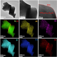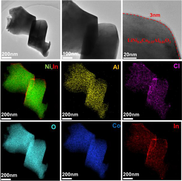 Finally, TEM was performed on the cathode mixture of NCA/LIC/Cl1.5/Li-In battery after 100 cycles at elevated temperature to gain deeper insights into the superior battery performance. As shown in Fig. 4, the intact NCA particles are observed in the images of cycled cathode. Moreover, a uniform layer of amorphous substance with a thickness of 3 nm is detected surround the chosen NCA particle. EDX mapping results confirms that the In-containing material is homogenous distributed over the chosen particle. This phenomenon has never been observed in previous studies. During the very beginning of the cycling test at elevated temperature, Li3InCl6 electrolytes in the cathode mixture immediately react with the bare NCA cathode to creat an In-containing amorphous substance, which can stabilize the interface between the NCA and Li3InCl6 in the following electrochemcial progress, resultsing in effective Li-ion transport across the interface and delivering superior cyclability with high discharge capacities. Similarly, TEM was also conducted on the cycled cathode mixture of NCA/Cl1.5/Li-In cell at 60 ℃. EDX mapping results in Fig. S6 (Supporting information) show that Al element is detected in the Li5.5PS4.5Cl1.5 electrolyte side. In other words, the Al element in NCA particles is diffused, which is associated with the side reaction between these two materials. The discharge capacities degrades rapidly due to the intense side raction at higher temperature during the cycle, as the battery performance shown in Fig. 2e.
