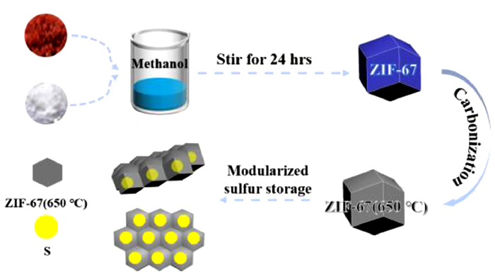 In summary, a new modularized sulfur storage strategy is proposed and accomplished via employing 100% space utilization host material of cobalt loaded carbon nanoparticles derived from ZIF-67. Modularly dispersing sulfur can not only greatly increase the proportion of active sulfur, but also inhibit the shuttle effect and volume expansion, thereby improving the cycle stability of the LSBs. Moreover, due to the close accumulation of the rhombic dodecahedron structure, the surface-to-surface contact between the crystals also greatly enhances the conductivity of the cathode side. Cells assembled with ZIF-67 (650 ℃) exhibit significantly better performance when compared with those assembled with other shapes of cathode host materials. Moreover, ZIF-67 (650 ℃) possesses sufficient excellent conductivity, abundant Co particles and rich N-doped structures, which have high catalytic activity for electrochemical reaction and can effectively improve the redox kinetics. This work confirms the feasibility of modular dispersion treatment of sulfur and exhibits a new cathode host material for improving the performance of LSBs.