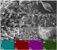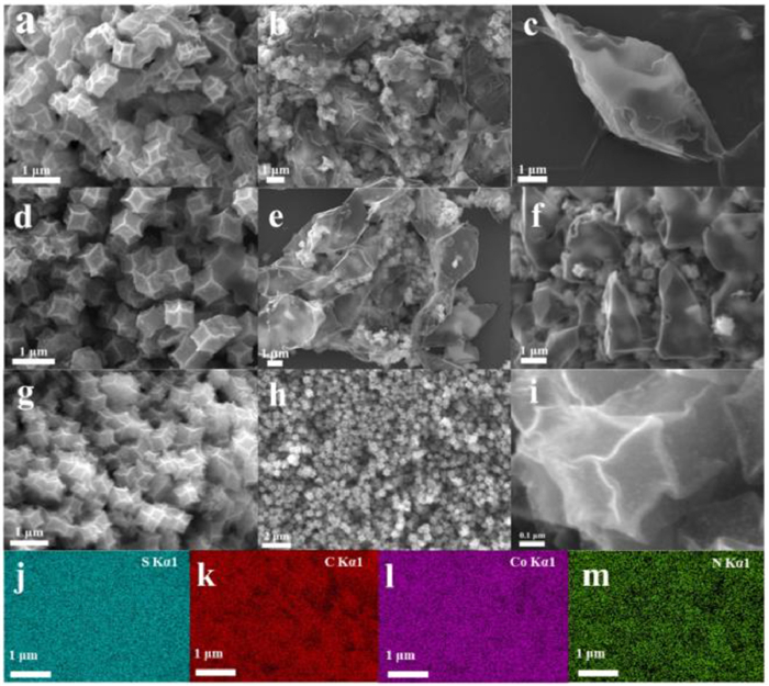 | Fig. 3. SEM of samples carbonized at (a) 500 ℃, (d) 800 ℃, (g) 650 ℃, (b, c) S@ZIF-67 (500 ℃), (e, f) S@ZIF-67 (800 ℃), (h, i) S@ZIF-67 (650 ℃). EDS image of S@ZIF-67 (650 ℃): (j) S, (k) C, (l) Co, (m) N (corresponding to Fig. 3h). | |