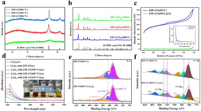| Fig. 4. XRD patterns of (a) carbonized samples and (b) carbonized samples@S. (c) N2 adsorption/desorption isothermal linear plots and pore size distribution of ZIF-67 (650 ℃) before/after sulfur loading. (d) Static adsorption test of Li2S6 on different materials and UV−vis spectra with corresponding photos of Li2S6 solution before and after adsorption test. (e, f) High-resolution N 1s and Co 2p XPS spectra of the ZIF-67 (650 ℃) and ZIF-67 (650 ℃) after adsorption test of Li2S6. | |