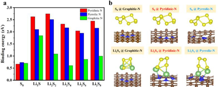 | Fig. 5. (a) Binding energy between Li2Sn, S8 and pyridinic N, pyrrolic N and graphitic N. (b) Adsorption model of Li2S4, S8 with pyridinic N, pyrrolic N and graphitic N. | |