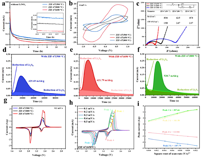 | Fig. 7. (a) The shuttle currents of LSBs with different cathode host materials. (b) CV curves of Li2S6 symmetric cells with different electrodes. (c) The electrochemical impedance spectroscopy spectra of the cells with different cathode host materials. (d-f) Potentiostatic discharge plots of cells with different cathode host materials at 2.05 V. (g) CV profiles of Li-S cells with different cathode host materials at a scan rate of 0.1 mV/s. (h, i) CV curves and relationships between peak current and scan rate of cell with ZIF-67 (650 ℃) as cathode host material at different scan rates respectively. | |