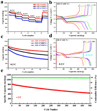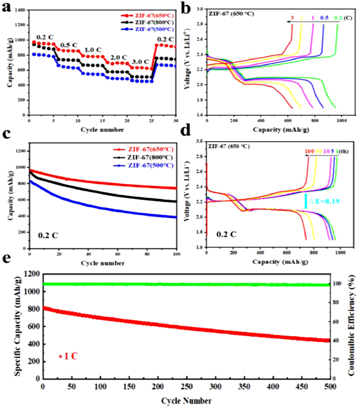 | Fig. 8. (a) Rate performance of cells with different cathode host materials at different specific current. (b) Galvanostatic charge-discharge profiles of cell with ZIF-67 (650 ℃) as cathode host material under different C-rates. (c) Cycling performance of cells with different cathode host materials at 0.2 C. (d) Galvanostatic charge-discharge profiles of cell with ZIF-67 (650 ℃) as cathode host material at 0.2 C. (e) Long-term cycling stability of cell with ZIF-67 (650 ℃) as cathode host material at 1 C. | |