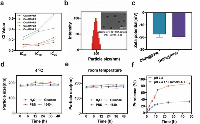 | Fig. 2. (a) CI value in different ratios of physical mixture between Oxa and DN. (b) Size distribution and TEM image (inserted) of DNPt@PPRI. Scale bar: 200 nm. (c) Zeta potentials of DNPt@PPR and DNPt@PPRI. (d) The stability of DNPt@PPRI at 4 ℃ and (e) room temperature. (f) Release profile of DNPt@PPRI in phosphate buffer at pH 7.4 and pH 7.4 + 10 mmol/L DTT. Mean ± SD (n = 3). | |