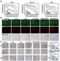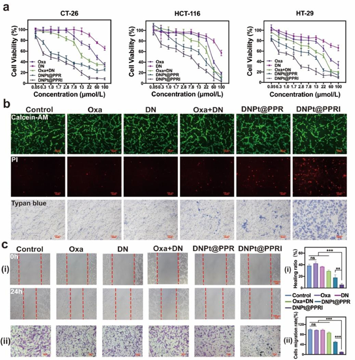 | Fig. 3. Anti-tumor activity of DNPt@PPRI in vitro. (a) Cytotoxicity of various formulations as determined by the MTT assay in CT-26 cells. (b) Calcein-AM/propidium iodide (PI) double staining and Trypan blue staining of CT-26 cells after different treatments. Scale bar: 100 µm. (c) Wound healing (ⅰ) and migration assays (ⅱ) in CT-26 cells after different treatments. Scale bar: 100 µm. Mean ± SD (n = 3. **P < 0.01, ***P < 0.001. ns, no significance). | |