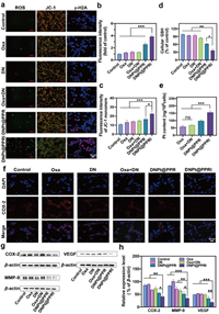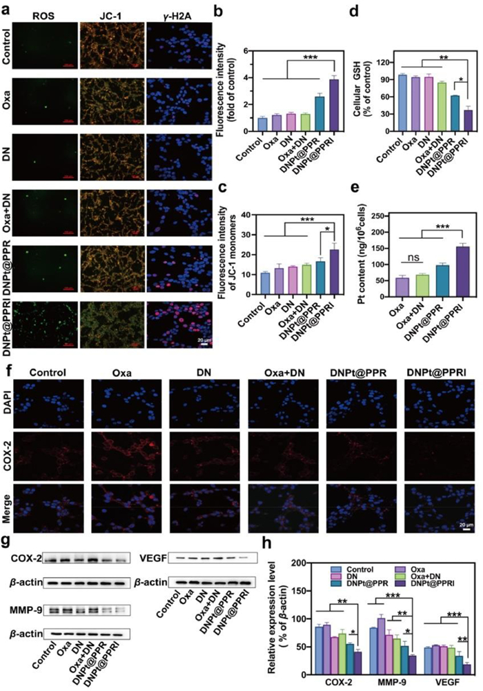 | Fig. 4. The mechanism of anti-tumor effect by DNPt@PPRI. (a) Determination of intracellular ROS contents by DCFH-DA probe, JC-1 fluorescent probe staining (scale bar: 100 µm) and Immunofluorescence of γ-H2AX (scale bar: 20 µm) in CT-26 cells after treatments. (b) Fluorescence intensity of ROS (n = 3). (c) Fluorescence intensity of JC-1 monomers (n = 3). (d) Intracellular GSH level detected by GSH assay kit (n = 3). (e) Cellular uptake of Pt by ICP-MS (n = 3). (f) COX-2 expression in CT-26 cells with different formulations after TNF-α treatment. Scale bar: 20 µm. (g) Western blot analysis and quantitative analysis (h) of COX-2, MMP-9, VEGF in CT-26 cells. Mean ± SD (n = 3. *P < 0.05, **P < 0.01, ***P < 0.001). DAPI, nuclear staining with blue. | |