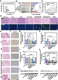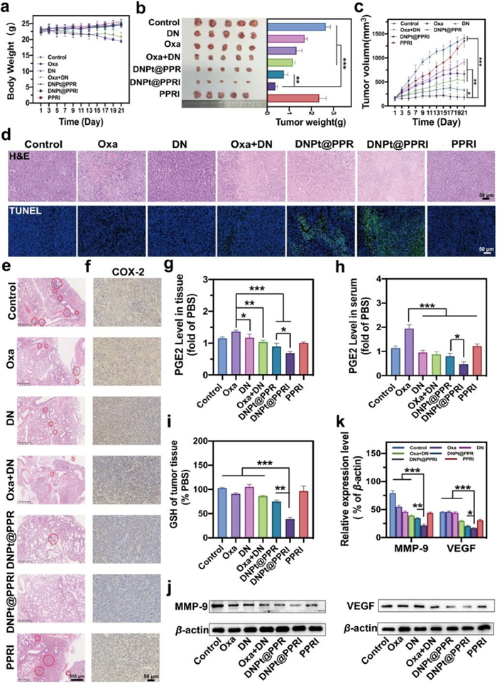 In addition, the ability of DNPt@PPRI to inhibit lung tumor metastasis was investigated according to lung H & E staining (Fig. 5e). No obvious metastatic nodules were observed in the DNPt@PPRI treatment group compared other groups, indicating that tumor metastasis to the lung was well controlled. As shown in Fig. 5f, immunohistochemical staining of COX-2 in tumor tissues showed that COX-2 protein expression was significantly decreased after treatment with DNPt@PPRI. Next, PGE2 levels in tumor tissues and serum were detected, and the results showed that PGE2 level was up-regulated after Oxa treatment. And the level of PGE2 was significantly decreased after treatment with DNPt@PPRI, indicating that DNPt@PPRI significantly enhanced the accumulation of COX-2 inhibitors (DN) within the tumor, thereby improving the inflammatory tumor microenvironment (Figs. 5g and h). As shown in Fig. 5i, GSH content in tumor treated by DNPt@PPRI group is significantly reduced, further confirming that the strategy of GSH depletion can adequately improve the anticancer efficacy of Oxa in vivo. In addition, immunohistochemical staining (Fig. S19 in Supporting information) and western blot were also used to detect the expression of metastasis-related proteins (Figs. 5j and k). In the final preparation group, MMP-9 and VEGF protein expressions were significantly down-regulated compared to other groups. The above anti-tumor results in vivo fully demonstrated that DNPt@PPRI enhanced the anti-tumor effect of Oxa due to the GSH depletion ability, and played a strong synergistic effect with DN, thus showed the strongest anti-tumor activity in vivo.