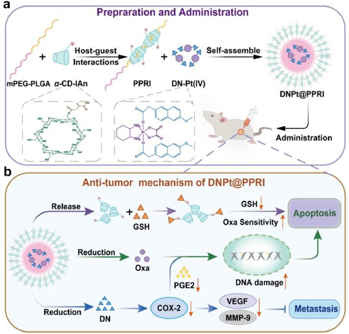 In summary, we have rationally designed a GSH-depleting cyclodextrin pseudo-polyrotaxane nano-system, namely DNPt@PPRI. We synthesized GSH depletion vector loaded with anti-inflammatory Oxa(Ⅳ) prodrug for the treatment of CRC. After the nanoparticles were taken up by tumor cells, it releases Oxa and DN under the action of GSH, which induced DNA damage and down-regulation of COX-2 and PGE2 and then synergistically induced cell apoptosis and inhibited metastasis. More importantly, depletion of GSH by IAn-modified cyclodextrin pseudo-polyrotaxane could enhance Oxa sensitivity and improve therapeutic efficacy. Both in vitro and in vivo experiments showed that our system had strong anti-tumor ability and good biological safety. This study not only overcomes the inflammatory defect induced by Oxa chemotherapy and plays the dual anti-tumor effect of Oxa and COX-2 inhibitor, but also overcomes the limitation of easy detoxification of Oxa, which has potential application value in the clinical treatment of platinum-sensitive colorectal cancer.