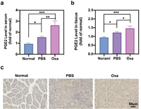 | Fig. 1. PGE2 levels in serum (a) and colon tissues (normal) or tumors (PBS, Oxa) (b). (c) Immunohistochemistry of COX-2 in colon tissues (normal) or tumors (PBS, Oxa). Mean ± standard deviation (SD) (n = 3. *P < 0.05, **P < 0.01, ***P < 0.001). | |