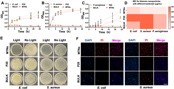 | Fig. 2. In vitro antibacterial activity of the MTNs. (A–C) Growth curves of E. coli, S. aureus, and P. aeruginosa after incubating with MTNs, P25, and BULK for 24 h. (D) Heat map of the MIC for MTNs, P25, and BULK against bacteria for 24 h. (E) Surface antibacterial behaviors of MTNs, P25, and BULK (scale bar, 10 mm). (F) Living and dead bacteria staining of MTNs, P25, and BULK (scale bar, 100 µm). Results are shown as mean ± SD (n = 3). PI, propidium iodide; DAPI, 4′,6-diamidino-2-phenylindole. | |