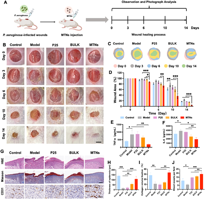 | Fig. 3. In vivo performance of promoting P. aeruginosa-infected wound healing of MTNs. (A) Schematic construction and treatment of a P. aeruginosa-infected wound mouse model. (B) Representative images of wounds treated with MTNs, BULK, and P25 at different time points (n = 6; scale bar, 5 mm). (C) Corresponding schematic diagram of wound area changes at different time points. (D) Wound area (%) at different time points after treatment. (E, F) Levels of proinflammatory cytokines, including TNF-α and IL-6 on day 3, n = 3. (G) Representative images of H&E (scale bar, 100 µm), Masson's trichrome staining (scale bar, 100 µm), and immunohistochemistry staining of CD31 (scale bar, 50 µm) of the regenerated wound tissues on the 14th day, n = 3. (H–J) Corresponding quantification of epidermis thickness, collagen content, and regenerated blood vessels in wound tissues on the 14th day based on (G). Results are shown as mean ± SD. (*P < 0.05, **P < 0.01, and ***P < 0.001). | |