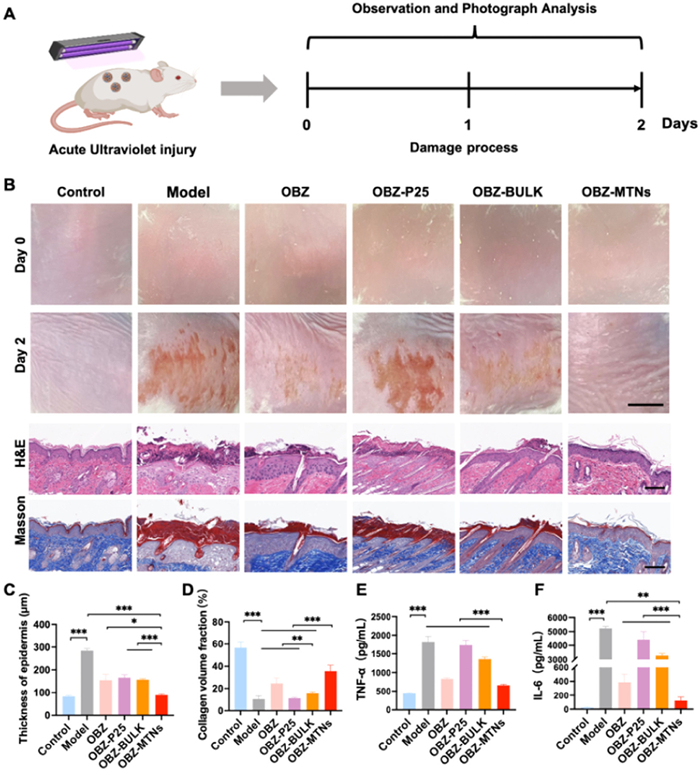 | Fig. 4. Examination of UVA protection capability of OBZ-MTNs on mouse back skin. (A) Schematic construction of an acute ultraviolet injury mouse model. (B) Representative images of skin lesions treated with OBZ, OBZ-MTNs, OBZ-BULK and OBZ-P25 at different time points (n = 6; scale bar, 10 mm) and images of H&E (scale bar, 100 µm), Masson's trichrome staining (scale bar, 100 µm) of the skin tissues on the 2nd day, n = 3. (C, D) Corresponding quantification of epidermis thickness and collagen content in skin tissues on the 2nd day based on (A). (E, F) Levels of proinflammatory cytokines, including TNF-α and IL-6 on day 2, n = 3. Results are shown as mean ± SD (*P < 0.05, **P < 0.01, and ***P < 0.001). | |