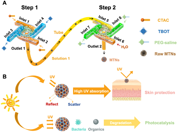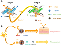 | Scheme 1. Schematic illustration of the development of the two-step flash nanocomplexation (FNC) process to fabricate mesoporous titanium nanoparticles (MTNs) for biomedical applications. (A) Synthesis of the MTNs with sequential FNC method. (B) MTNs enabled ultraviolet absorption and photocatalytic properties to degrade organic waste and kill bacteria. | |