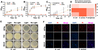 The suitability of TiO2 as a photocatalyst has been substantiated by its favorable band gap and position, elevated quantum efficiency and sustained stability. Consequently, this material has found extensive application in the elimination of contaminants during water and air purification [28,29]. To assess the catalytic performance of MTNs for organic matter decomposition, methylene blue (MB) and tetracycline (TC) were selected as model pollutants to measure the change in their respective colors. As shown in Fig. 1E, the degradation of MB was found to be significantly more efficient with MTNs than with other groups upon the exposure to light, with MTNs degrading approximately half of the MB within a 10 min timeframe. In contrast, both BULK and P25 required at least 30 min to achieve the same level of degradation. Similarly, it was observed that approximately 50% of the total TC was degraded within a 30-min timeframe when exposed to light with MTNs, while the BULK and P25 groups only achieved approximately 35% TC degradation in a 75-min timeframe (Fig. 1F). These findings demonstrated that MTNs exhibited superior catalytic activity compared to the P25 and BULK under light conditions. Furthermore, the catalytic efficiency of MTNs was notably enhanced under light irradiation, highlighting the significance of illumination in promoting MTNs' catalytic performance. This phenomenon might be attributed to the semiconductor property of TiO2 with a band gap of approximately 3.0 eV, which enabled the excitation of electrons and holes when exposed to UV light (with wavelengths shorter than ~400 nm). The photogenerated electrons then react with O2 to produce ·O2−, while the photogenerated holes react with water to produce ·OH [30–33]. These reactive radicals worked together to decompose organic compounds. The prolonged exposure of the TiO2 to UV light lead to the degradation of a greater quantity of organic material, indicating the excellent catalytic performance of MTNs might have great potential in bacterial killing under light irradiation.