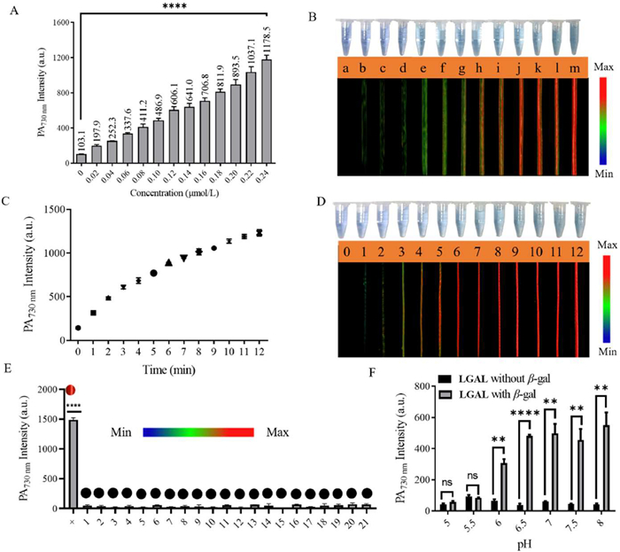 | Fig. 1. The PA730 images of LGAL (20 µmol/L) to β-gal in vitro. (A) PA730 images of 20 µmol/L LGAL with 0–0.24 U/mL β-gal at pH 7.4. (B) The color image under natural light and corresponding PA images (λex = 730 nm) of probe LGAL (20 µmol/L) upon the addition of β-gal (a, 0; b, 0.02; c, 0.04, d, 0.06; e, 0.08; f, 0.10; g, 0.12; h, 0.14; i, 0.16; j, 0.18; k, 0.20; l, 0.22; m, 0.24 U/mL). (C) PA730 images of 20 µmol/L LGAL and β-gal with time (0–12 min). (D) The color image under natural light and corresponding PA images (λex = 730 nm) of probe. (E) PA730 image of LGAL (20 µmol/L) with β-gal (0.24 U/mL) and other interferences (1. CO32−, 2. Mn2+, 3. I−, 4. Na+, 5. Co2+, 6. K+, 7. Mg2+, 8. Cu2+, 9. F−, 10. NO2−, 11. ClO−, 12. ACN−, 13. HSO3−, 14. HS−, 15. Hcy, 16. GSH, 17. Cys, 18. α-D-glucose, 19. lysozyme, 20. pepsin, 21. cellulase). (F) PA730 image of 20 µmol/L LGAL with 0.24 U/mL β-gal at solutions with different pH. Mean ± standard deviation (SD), n = 3. ns, P > 0.05; **P < 0.01, ****P < 0.0001. | |