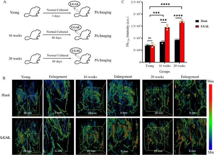 | Fig. 2. Endogenous PA imaging in living mice with LGAL. λex = 730 nm. (A) Model of Endogenous imaging of mice (4 weeks, young; 16 weeks; 20 weeks). (B) PA imaging of mice. (C) Image of experimental data of endogenous PA in mice. Mean ± SD, n = 3. ***P < 0.001, ****P < 0.0001. | |