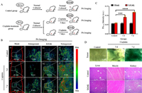 | Fig. 3. PA imaging of aging in the tumors of living mice with LGAL. (A) Model of imaging of mouse. (B) PA imaging of the tumors of mice. (C) Image of experimental data of PA intensity in mice. (D) X-gal staining of the slices of the tumors and the histopathological results of different organs (liver, muscle of the injection site, and kidney) about control group and obese mice exposed to 100 µL 2 mmol/L LGAL for 7 days (magnification = ×100). λex = 730 nm, Mean ± SD, n = 3. ***P < 0.001, ****P < 0.0001. | |