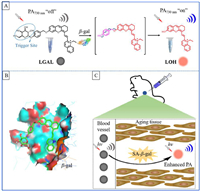 | Scheme 1. Schematic illustration of the aging-responsive near infrared (NIR) PA probe LGAL. (A) Catalyzed mechanism of LGAL activated by β-gal. (B) The catalytic mechanism of LGAL and β-gal. (C) The probe LGAL is activated in the aging vessels and tissues. | |