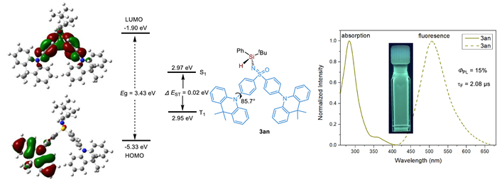 To illustrate the utility of this methodology, we designed a sulfoximine substrate 2n featuring a 9,9-dimethyl-9,10-dihydroacridine unit as a typical donor (D) and a sulfoximine unit itself as an elegant acceptor (A). Under the standard reaction conditions, the corresponding enantioenriched N-silylated sulfoximine product 3an was obtained in 91% yield with 97% ee. Molecular modeling of 3an by DFT revealed an almost perpendicular D-A conformation with a dihedral angle of 85.7° in the ground state (Fig. 1). Efficient spatial separation of HOMO and LUMO distribution in the ground state, together with a small singlet-triplet energy gap (ΔEST) of 0.02 eV were disclosed by theoretical calculation. These properties showed a potential possibility for the entitled product to find utility in TADF materials [52-56]. Moreover, a microsecond level of fluorescent lifetime τF = 2.08 µs for 3an in CH2Cl2 (10−5 mol/L) was detected at room temperature (Section 6 in Supporting information). The photophysical properties of 3an elucidate that the UV-vis absorption maxima and emission maxima of 3an are around 284 and 504 nm, respectively, thus featuring a large Stokes shift of 220 nm. Meanwhile, ΦPL of 3an in CH2Cl2 (10−5 mol/L) at room temperature was measured to be 15% by integrating sphere.