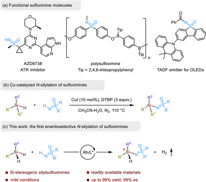 Sulfoximines, isosteres of sulfones, are valuable motifs in many scenarios [1-3]. Besides the traditional utilization as catalysts and ligands in synthetic chemistry [4-9], sulfoximines are also intensively investigated in medicinal chemistry as key pharmacophores (Scheme 1a, left) [10-14]. In addition, studies on sulfoximines have also branched out into materials science. For example, Takata and Bolm introduced sulfoximine units into polymers (Scheme 1a, middle) [15,16]; Yang et al. designed a sulfoximine unit as a new acceptor for thermally activated delayed fluorescence (TADF) emitters featuring tunable electron-accepting ability (Scheme 1a, right) [17,18]. What goes beyond sulfones is that sulfoximines can conveniently regulate physicochemical properties through N-H functionalization. Synthetic protocols for N-functionalization of sulfoximines have been widely explored, such as N-phosphorylation, acylation, halogenation, alkynylation, alkylation, arylation [19-22]. Despite vast established methods for N-H functionalization, N-silylation of sulfoximines has been less explored. Traditionally, chlorosilanes or silylamine reagents are used to conduct silylation of sulfoximines, which usually have problems due to the hygroscopically sensitive starting materials [23-27]. In 2015, Cheng and co-workers reported a direct oxidative cross-coupling reaction towards N-silylated sulfoximines via a copper-catalyzed N-silylation of sulfoximines with various 3° silanes in the presence of stoichiometric DTBP (Scheme 1b) [28].
