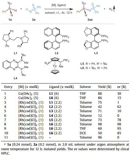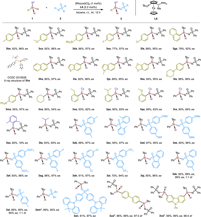 At the outset of our studies, we examined this cross-coupling reaction between tert-butylphenylsilane 1a and diphenylsulfoximine 2a using copper or rhodium as the catalyst with chiral phosphine ligands. Under copper catalysis, we could obtain good yields of the targeted cross-coupling product 3aa, albeit with poor stereocontrol (Table 1, entries 1 and 2). When we moved on to rhodium catalyst, an obvious increase of enantioselectivity was observed using [Rh(cod)Cl]2 combined with BINAP L2 as the catalyst and chiral ligand respectively (Table 1, entry 4). To our delight, when Josiphos L5 was applied with [Rh(cod)Cl]2 in this reaction, both the yield and enantioselectivity could be obtained from moderate to good (Table 1, entry 7). Further switching the substituted groups on the phosphorus atoms of the Josiphos ligand, almost quantitative yield and enantiomeric excess (ee) were obtained (Table 1, entry 8). Under the rhodium-catalyzed conditions, other diphosphine ligands such as Ph-BPE L1, Segphos L3, and QuinoxP* L4 gave barely stereocontrol with low to moderate yields (Table 1, entries 3, 5 and 6). More polar solvents such as THF, and DCE did not show a positive impact on the reaction (Table 1, entries 9 and 10). It is worth mentioning that, the reaction could proceed smoothly without the use of any ligand under [Rh(cod)Cl]2-catalyzed conditions with a high yield (Table 1, entry 11). In summary, the best reaction conditions we identified is that starting material dihydrosilane 1a and sulfoximine 2a could react with each other to give desired coupling product 3aa with both quantitative yield and ee in the presence of [Rh(cod)Cl]2 catalyst with Josiphos L6 as chiral ligand at room temperature in the solvent of toluene.