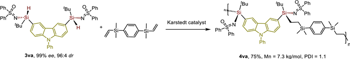 | Scheme 3. Polymerization of bis-silicon-stereogenic sulfoximine. 3va (0.1 mmol), 1,4-bis(dimethyl(vinyl)silyl)benzene (0.1 mmol) in THF (0.2 mol/L) with Karstedt catalyst (1 mol%) at 120 ℃ for 5 h, isolated yields; Mn and PDI were measured by GPC. | |
