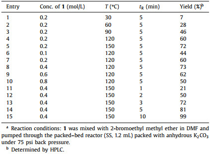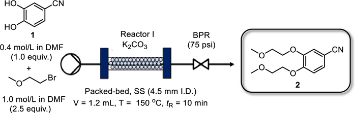During batch process optimization, we deemed potassium carbonate the most suitable base for catalyzing etherification. However, as potassium carbonate was not soluble in DMF, it tended to clog in a PTFE coil reactor, resulting in unstable reaction. Therefore, we chose a micro packed-bed flow reactor (inner diameter = 4.5 mm, length = 11 cm) to perform Williamson ether synthesis (Fig. 1). A DMF solution of 1 and 2-bromoethyl methyl ether was pumped through a packed-bed reactor filled with potassium carbonate as the base and SiO2 (100–200 mesh) for dispersion, using a back pressure regulator (BPR) at 75 psi at the end of the reactor coil to afford 2. The reaction solution was obtained after three residence times of stable operation, and the yields were calculated using high performance liquid chromatography (HPLC).