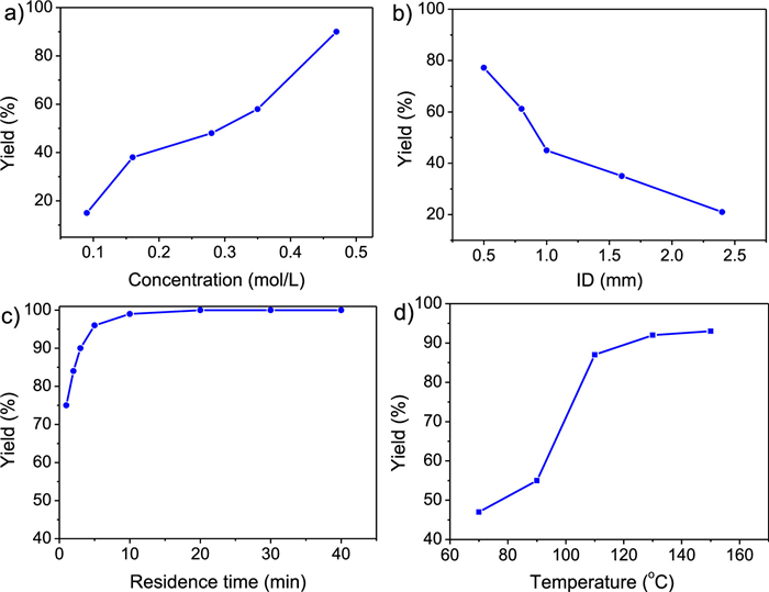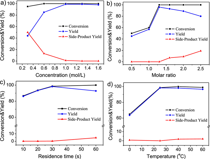 | Fig. 6. (a) Effect of the concentration of 4 on the reaction. Condition: T = 130 ℃, NDMF-DMA: N4 = 1.5, tR = 5 min, d = 0.5 mm; (b) Effect of inner diameter on the reaction. Condition: T = 130 ℃, C4 = 0.4 mol/L, NDMF–DMA: N4 = 1.5, tR = 5 min; (c) Effect of residence time on the reaction. Condition: T = 130 ℃, C4 = 0.47 mol/L, NDMF–DMA: N4 = 1.5, tR = 5 min, d = 0.5 mm; (d) Effect of temperature on the reaction. Condition: C4 = 0.4 mol/L, NDMF–DMA: N4 = 1.5, tR = 10 min, d = 0.5 mm. | |