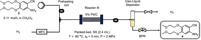 First, we evaluated the batch process for Erlotinib (Scheme 1), with 3, 4-dihydroxybenzonitrile and 2-bromoethyl methyl ether as starting materials. The conditions for the etherification, nitration, reduction, addition, and cyclization reactions were optimized, and the effects of reactant molar ratio, solvent, reaction time, and reaction temperature were investigated in detail (Tables S2-S6 in Supporting information). After conducting a preliminary evaluation, we converted the batch process to a continuous flow process.
