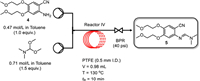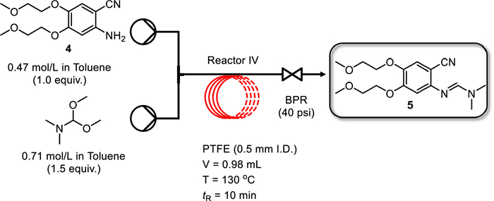 After investigating the hydrogenation conditions, the reaction conditions for the addition reaction of 4 were optimized (Fig. 5). 4 (in toluene) and DMF–DMA (in toluene) were loaded through inlets A and B, respectively, and mixed in a simple T–mixer before being introduced into a PTFE coil reactor.