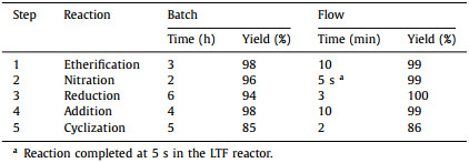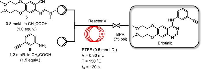 In summary, we successfully developed a new continuous flow process for the synthesis of Erlotinib. Using inexpensive reagents as starting materials, five reaction conversions were performed through five continuous flow units. Each individual step was successfully optimized to afford almost quantitative conversion via continuous flow synthesis. Compared to the conventional batch process, all steps of the continuous flow process considerably better in terms of reaction time and yield (Table 3). Finally, we demonstrated the continuous flow synthesis of Erlotinib with an overall yield of 83% and a total residence time of 25.1 min. Telescoping can be applied to entire process because of the fact that all the synthesis steps were optimized using the continuous flow process in a way that allowed quantitative conversion. In this paper, we treat telescoping as a conceptual conjecture without showing the actual telescoping process. We believe that continuous flow integration with drug synthesis is of great value for drug production.