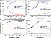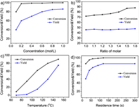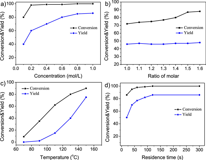 | Fig. 8. (a) Effect of the concentration of 5 on cyclization. Condition: T = 130 ℃, N6: N5 = 1.5, tR = 10 min; (b) Effect of molar ratio on cyclization. Condition: T = 130 ℃, C5 = 0.1 mol/L, tR = 10 min; (c) Effect of temperature on cyclization. Condition: C5 = 0.1 mol/L, N6: N5 = 1.5, tR = 10 min; (d) Effect of residence time on cyclization. Condition: T = 150 ℃, C5 = 0.8 mol/L, N6: N5 = 1.5. | |