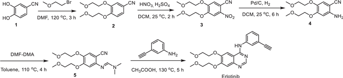 Cancer is a major cause of death and an important obstacle to improving life expectancy worldwide [1]. Lung cancer, an example of cancer caused by malignant tumors, is extremely harmful and one of the main causes of cancer-related deaths [2]. Erlotinib is a targeted antitumor drug for the treatment of non-small-cell lung cancer (NSCLC), which has gained wide market demand for its excellent therapeutic effects and tolerability [3-6]. Numerous synthetic routes for Erlotinib have been reported [7-13]. Although different starting materials are used in these routes, the main steps include etherification, addition, nitration, hydrogenation, cyclization, chlorination and amination reaction. Table S1 (Supporting information) presents several widely used synthetic routes, the synthetic routes were presented in Figs. S2-S4 (Supporting information).