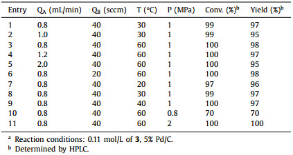 The experimental parameters were optimized by varying the residence time and reaction temperature. As shown in Table 2, a stable conversion is maintained at temperatures of 30 ℃ and 60 ℃, with a gradual increase in the flow rate of 3 but a slight decrease in yield, indicating that an extended residence time promotes the formation of 4 (Table 2, entries 1–5). Furthermore, the conversion and yield tended to increase with increasing temperature (Table 2, entries 3, 7–9), and fully conversion of the reaction could be achieved at 40 ℃. Then, the effect of pressure on yield was continuously studied in the packed–bed reactor. The reaction achieved full conversion at a pressure of 2 MPa (Table 2, entry 11). The hydrogen flow during continuous hydrogenation may shorten the residence time and intensify the gas–liquid mass transfer by increasing the turbulence, which strongly influences the conversion and selectivity of the reaction [36]. However, in this case, an increase in the gas flow rate did not cause any obvious changes in conversion (Table 2, entries 3 and 6); therefore, we believe that the gas–liquid phase has reached full mixing and that there was considerable overdosing of hydrogen. Finally, optimal hydrogenation conditions were obtained as follows: T = 60 ℃; QA = 0.8 mL/min; QB = 40 sccm and P = 2 MPa.