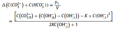 When the solution absorbed CO2, it reached the equilibrium again. For a unit volume of solution (V), assume in (step 1) that, y1 mol of CO2 is absorbed, so that the change of OH− in this process is also y1 mol, while the change of OH− in (step 2) is y2 mol. Then the below equations can be obtained.