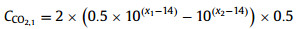 The consumption-absorption ratio of CO2 and NaOH was 1:2, and the pH value of the mixture (mixture of sodium hydroxide solution and solution at reactor outlet) is measured as x2. C(OH−) in solution has the following relation: