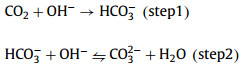 CO2 absorbed into the main body of the solution can be regarded as in forms of carbonate or bicarbonate ions converted via reactions, hence the equation shown as below: