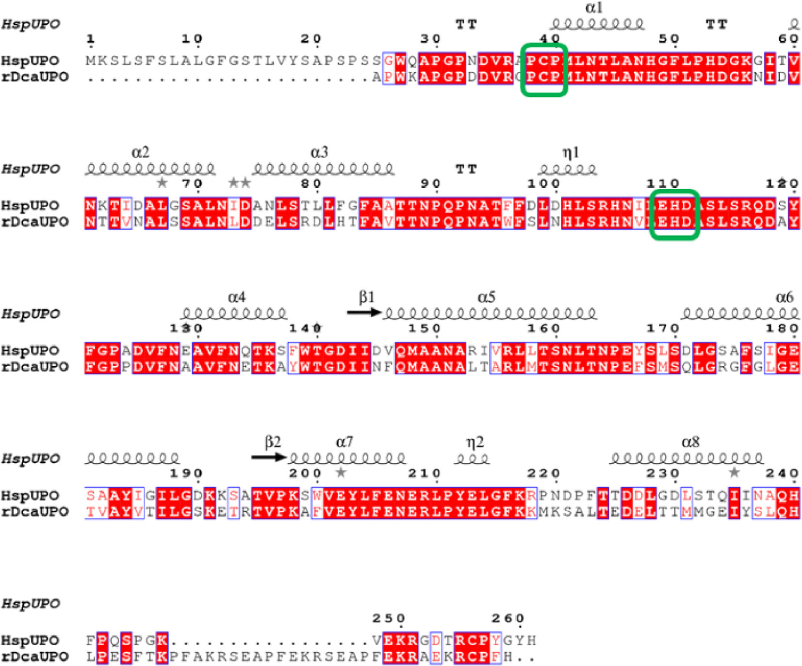 | Fig. 1. Structure-based amino acid sequence alignment of the mature rDcaUPO with the template HspUPO. Residues in the conserved PCP and EHD motif of the UPOs family were green frames. | |