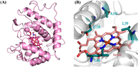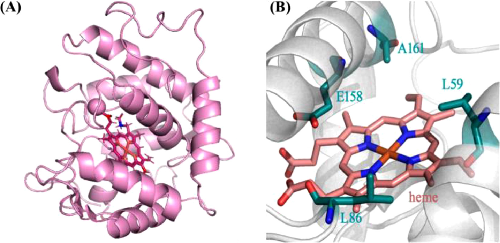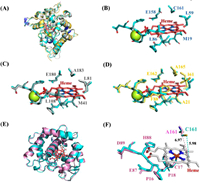 | Fig. 2. Selection of amino acid key sites in the region near the active center (green) of rDcaUPO. (A) The overall structure of the rDcaUPO wild type. (B) Amino acid key sites of the active center of the rDcaUPO wild type. | |