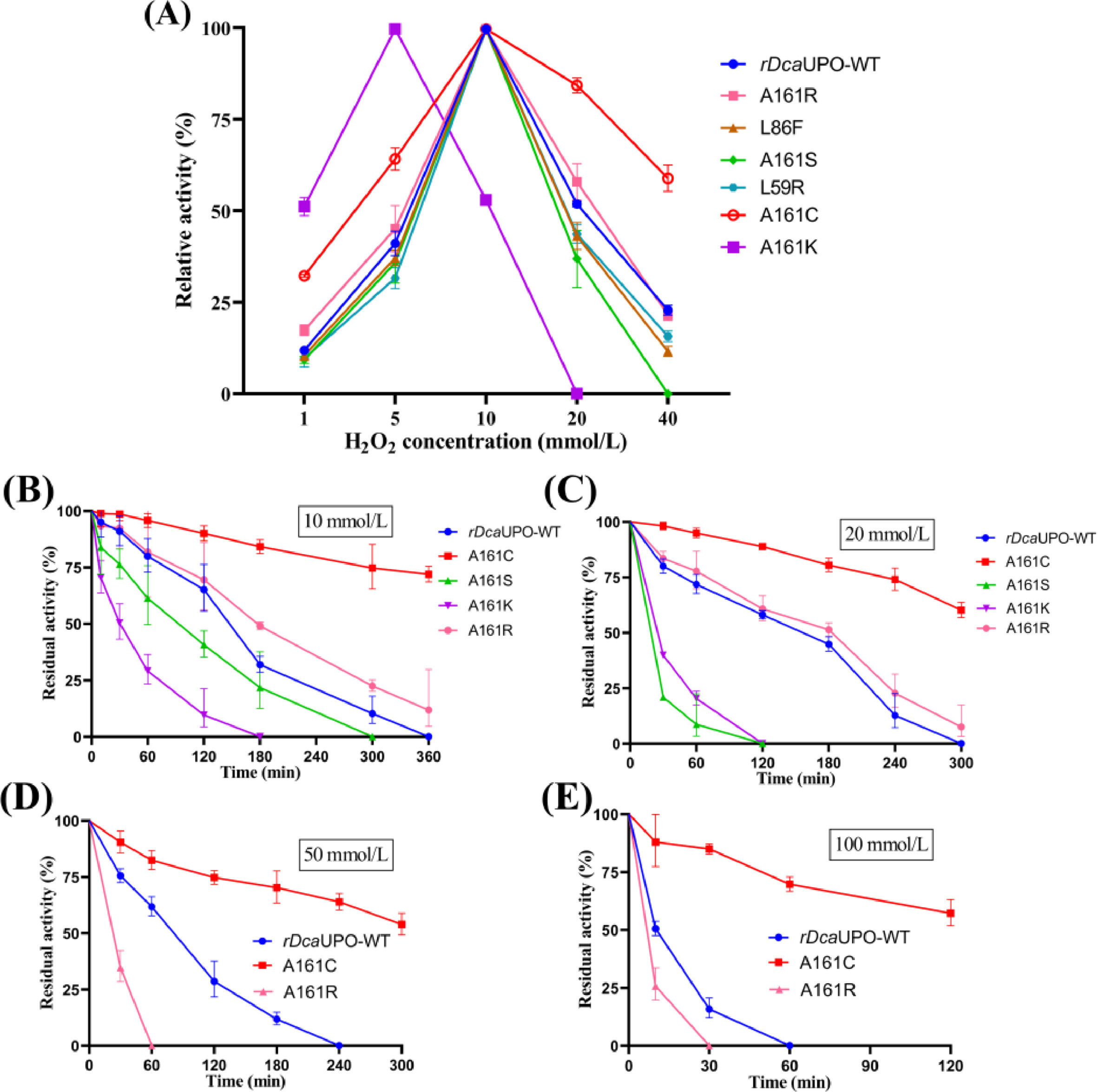 To detect the effect of mutants on heme protection, firstly, the optimal H2O2 concentration of the rDcaUPO wild type and mutants were compared using NBD as substrate. As shown in Fig. 3A, the rDcaUPO wild type and mutants L59R, L86F, A161R, A161S, and A161C showed an optimum H2O2 concentration of 10 mmol/L, whereas the optimum H2O2 concentration of A161K decreased to 5 mmol/L. Therefore, mutations of these key amino acids changed the optimal H2O2 concentration of rDcaUPO.