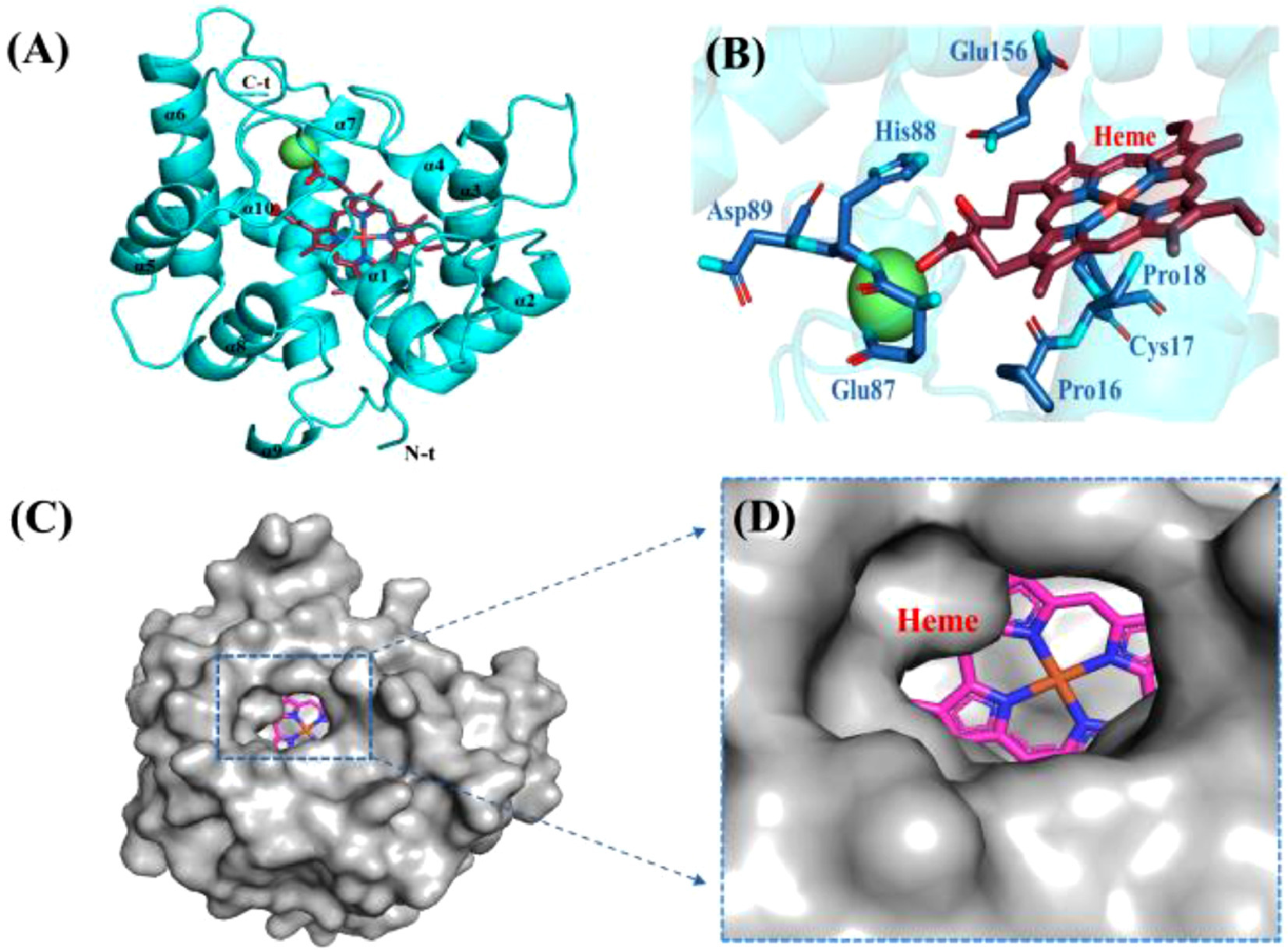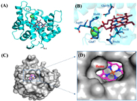 | Fig. 4. Structures of mutant rDcaUPO-A161C. (A) The overall structure of the mutant rDcaUPO-A161C. (B) Active sites of the mutant rDcaUPO-A161C. (C) Surface display of the mutant rDcaUPO-A161C. (D) Pocket of the mutant rDcaUPO-A161C. | |