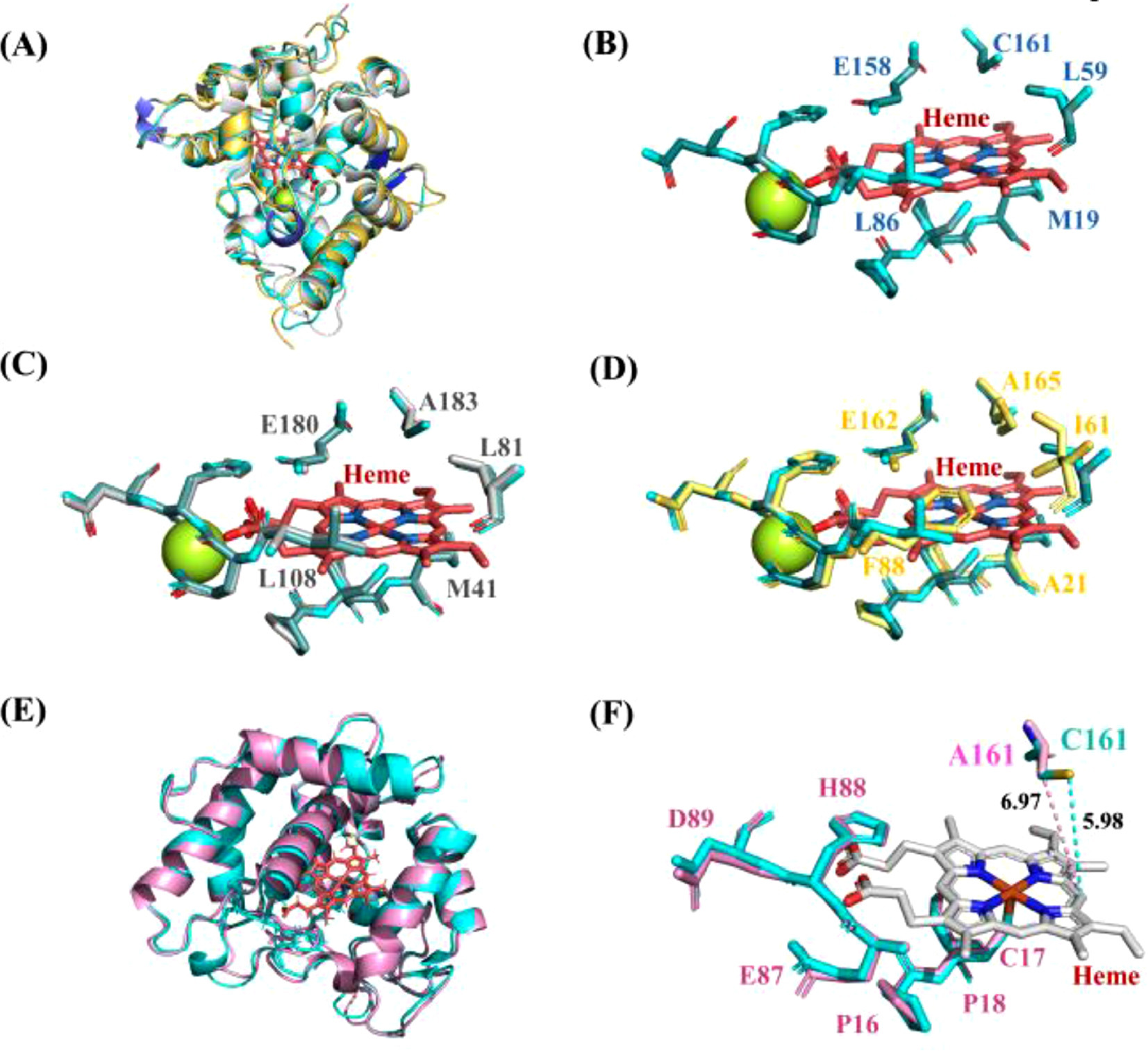 | Fig. 5. Stereo-view of the superimposition and the comparison of heme pocket residues (top) and access channels (bottom) between mutant rDcaUPO-A161C and other UPOs. (A) The overall structure comparison. (B) Active site key amino acids of mutant rDcaUPO-A161C. (C) The active site differences between mutant rDcaUPO-A161C (cyan) and HspUPO (gray). (D) The active site differences between mutant rDcaUPO-A161C (cyan) and rCviUPO (yellow). (E) Superposition of mutant rDcaUPO-A161C and wild type overall structure. (F) Major differences between mutant rDcaUPO-A161C and wild type (mutant in blue, wild type in pink). | |
