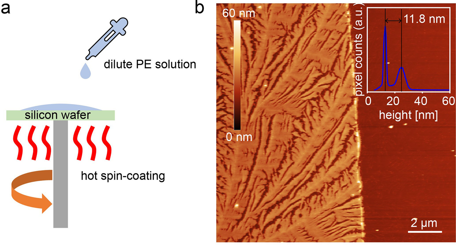 Ultra-thin PE films are prepared via hot spin-coating, with the schematic process shown in Fig. 1a and details in the experiment section (Supporting information). Morphology of the PE thin film is shown in Fig. 1b. In the PE thin film, branched single layer lamellae with average thickness of 11.8 nm are obtained. The thickness is similar to the characteristic thickness of polymer lamellar single crystal, so that the lamellae are likely corresponding to the flat-on orientation [30–32].