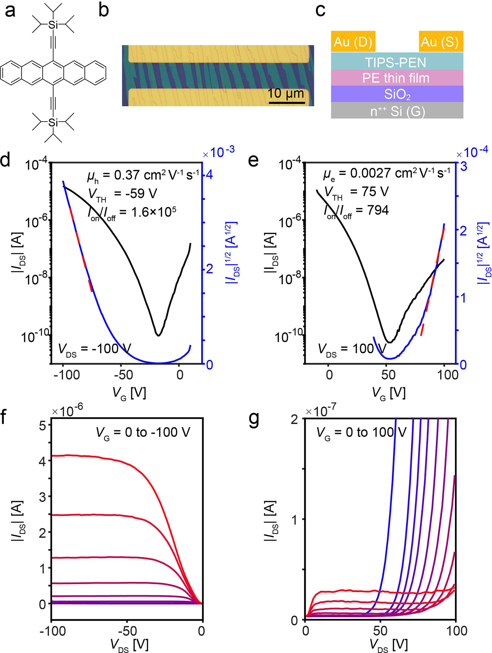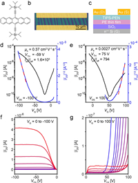 | Fig. 3. (a) Molecule structure for TIPS-PEN. (b) OM image for the OFET device with TIPS-PEN single crystals as semiconductor. (c) Schematic diagram for the OFET device based on PE thin film. (d, f) Typical transfer and output characteristics for the OFETs under p-channel operation modes. (e, g) Typical transfer and output characteristics for the OFETs under n-channel operation modes. | |