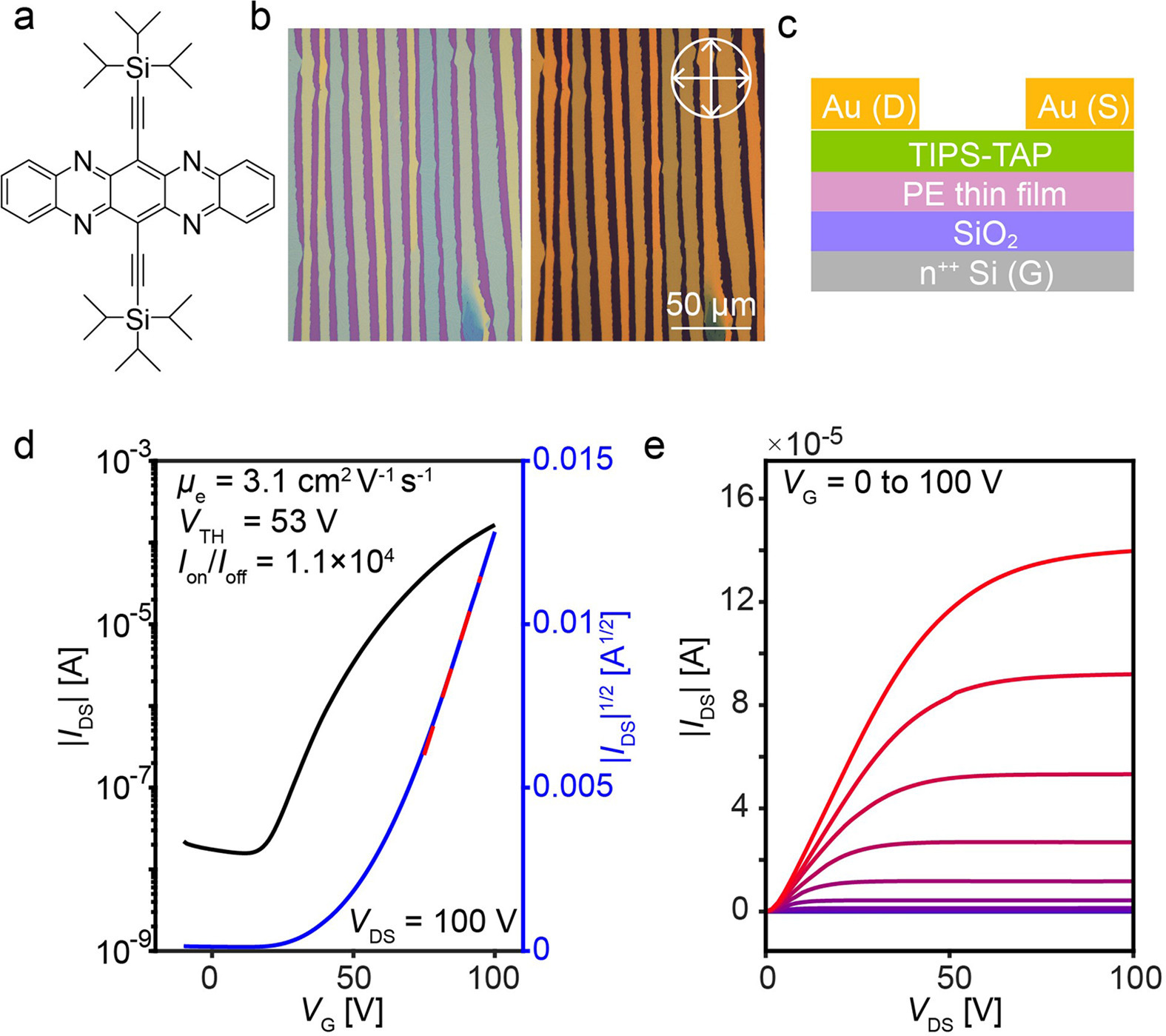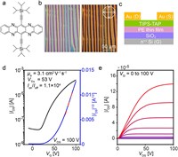 | Fig. 4. (a) Molecule structure of TIPS-TAP. (b) OM and POM images for TIPS-TAP single crystals grown on PE thin film. (c) Schematic diagram for the OFET device based on PE thin film. (d, e) Typical transfer and output characteristics for the OFET. | |
