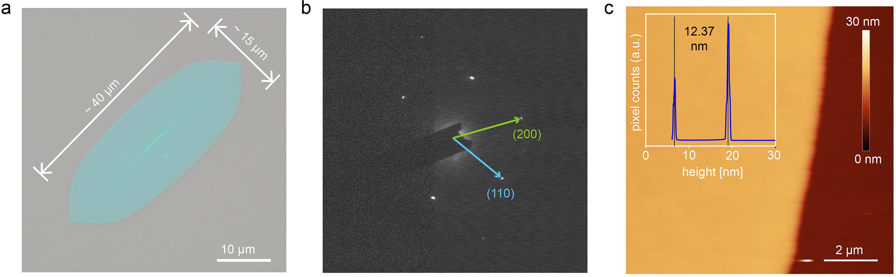 PELSCs are grown in dilute solution via self-seeding method. As shown in Fig. 5a, the PELSC shows a hexagonal lateral shape with lateral size of about 40 µm. The selected area electron diffraction (SAED) patterns shows that the PELSC corresponding to an orthorhombic crystal form with c-axis perpendicular to the crystal surface (Fig. 5b). Thickness of the PELSC is examined by AFM. Statistic of the AFM height image exhibits that the thickness of PELSC is 12.37 nm (Fig. 5c). The PELSC shows a uniform thickness and smooth surface without spiral dislocation or sub-microscopic defects. The outstanding surface quality makes the PELSC, compared with its thin film counterparts, a more promising candidate to improve the quality of gate dielectric/semiconductor interface in OFETs.