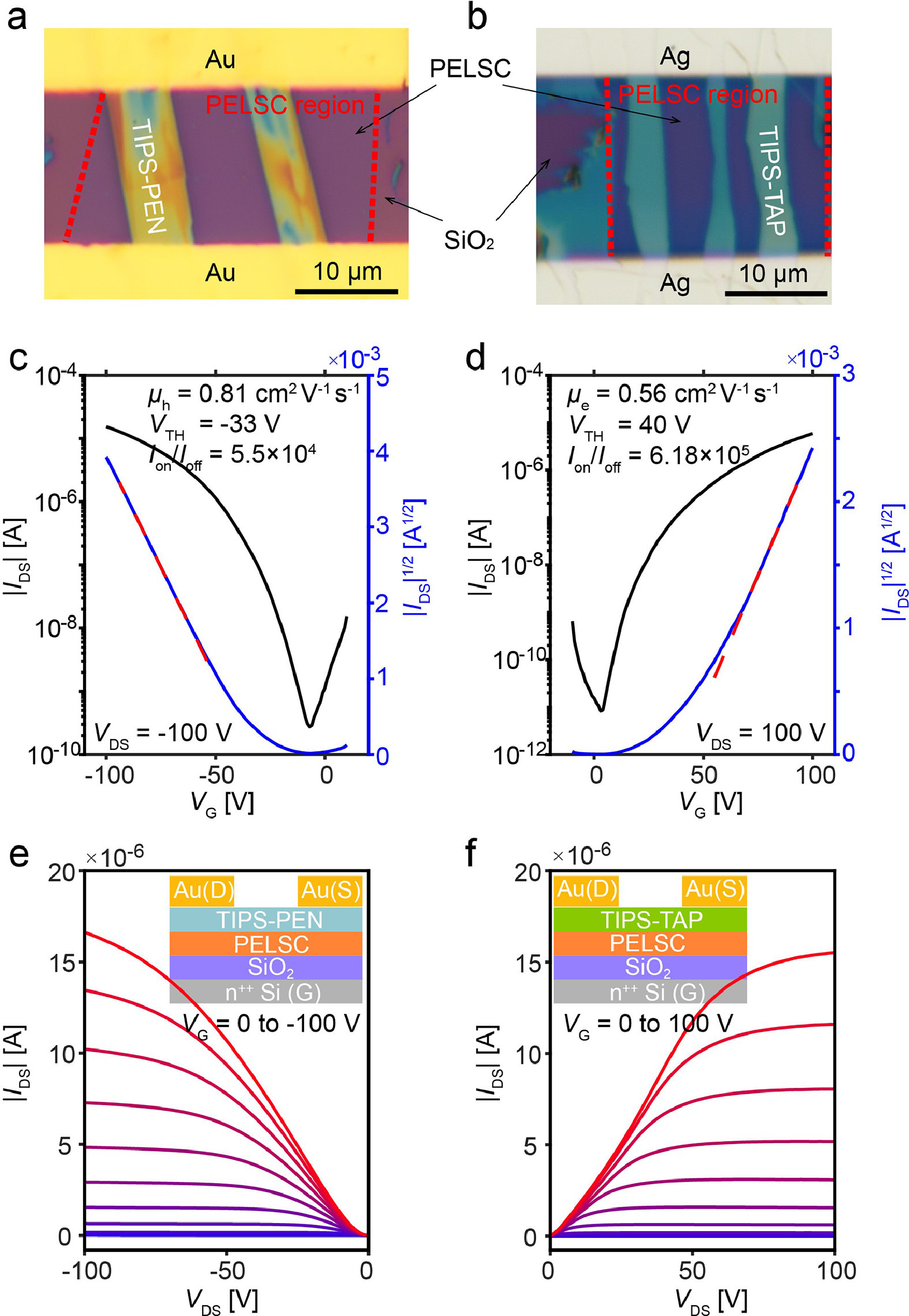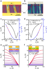 OFETs with PELSC/SiO2 as gate dielectric and TIPS-PEN or TIPS-TAP single crystals as semiconductors are obtained (Figs. 6a and b). TIPS-PEN and TIPS-TAP single crystals are directly grown on silicon wafer locally covered with PELSC. Devices are constructed in the overlapping area of PELSC and ribbon-like semiconductor single crystals.