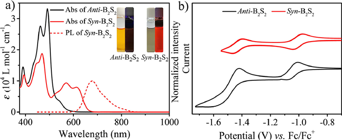 | Fig. 1. (a) UV–vis absorption of Anti-B2S2 in toluene (10−4 mol/L), UV–vis absorption and normalized emission spectra of Syn-B2S2 in toluene (10−4 mol/L). Photo insets illustrate the sample under ambient light and 365 nm irradiation. (b) Cyclic voltammogram of Anti-B2S2 and Syn-B2S2 with 0.1 mol/L TBA-PF6 as supporting electrolyte, Ag/AgCl as reference electrode, glassy carbon electrode as working electrode, Pt wire as the counter electrode. | |