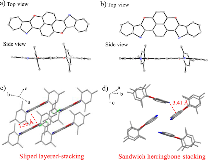 | Fig. 3. Single-crystal structures and packing of Anti-B2S2 (a, c) and Syn-B2S2 (b, d). Mes group and hydrogen atoms were omitted for clarity in top view, the blue-, red- and green-colored atoms represent S, B and Cl atoms. | |